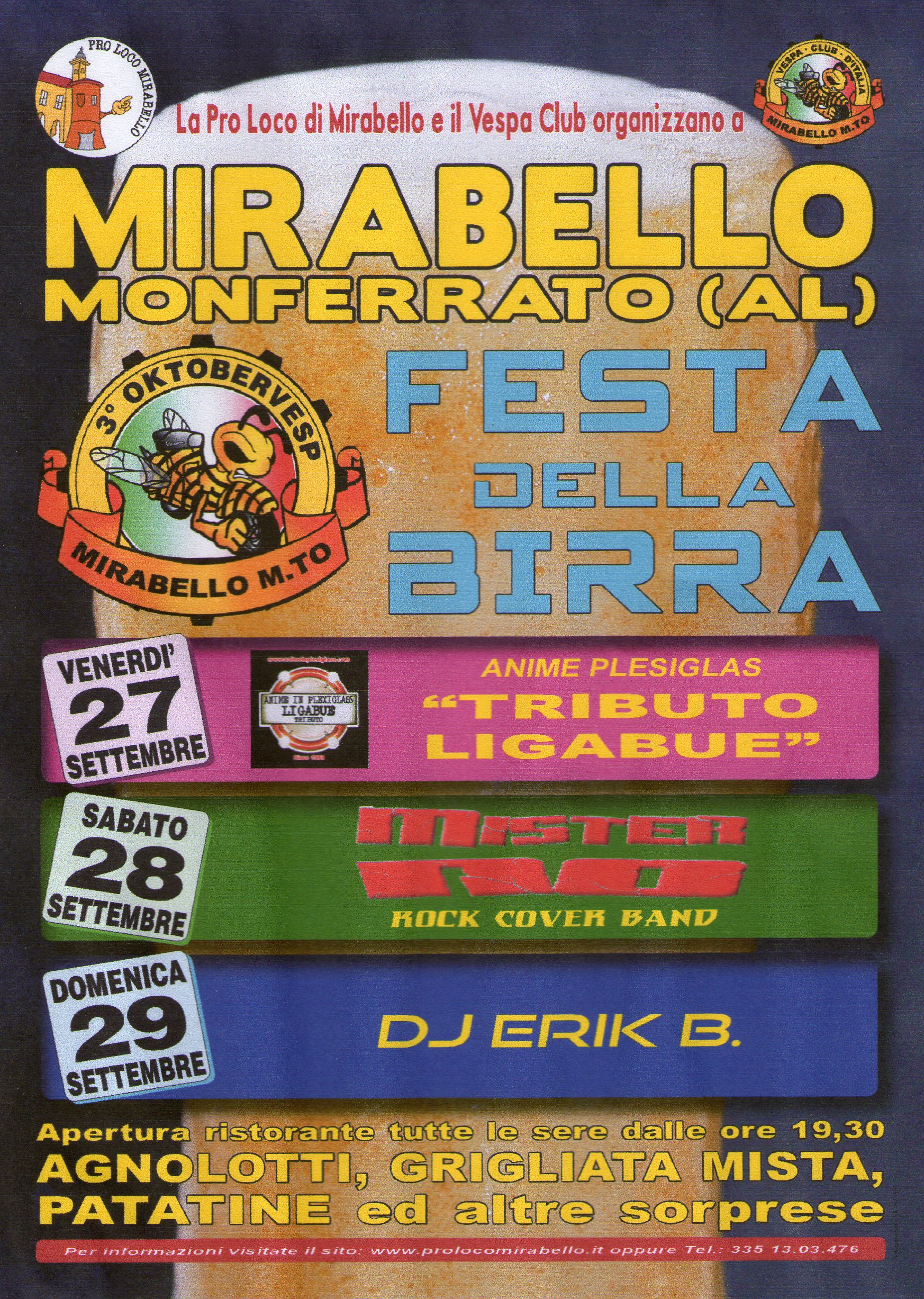 Il Vespa Club Mirabello, in collaborazione con la Pro Loco, organizza il 3° Oktobervesp con tanta musica, ottima birra e gustosità da mangiare.